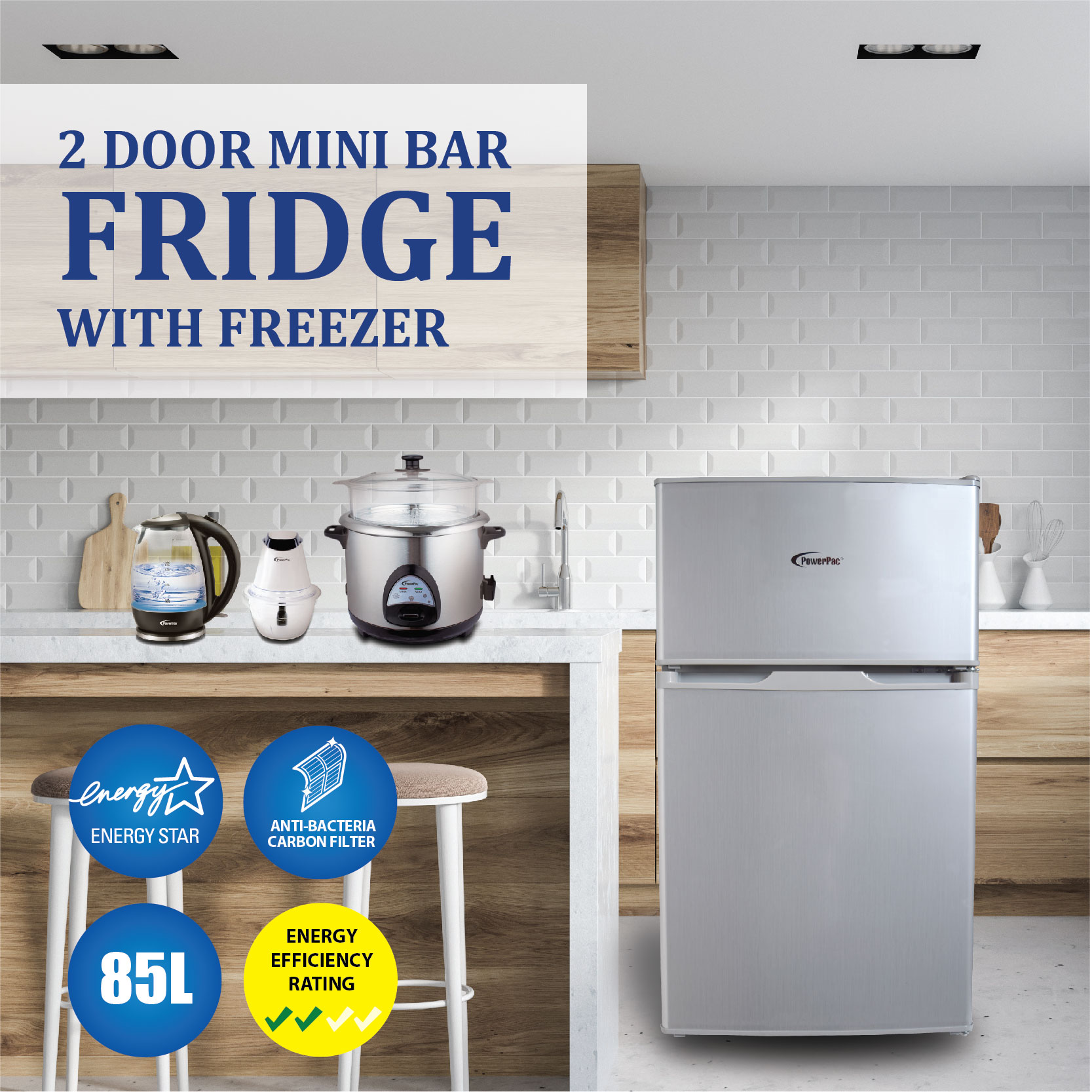 PowerPac 2 Door Mini Bar Fridge with Freezer 71L (PPF85)