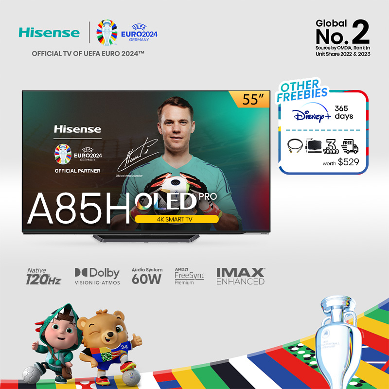 Hisense A85H OLED Smart TV 55 inch | 120Hz Native | Dolby Vision IQ & Atmos | HDR 10+ | 60W audio system | IMAX Enhanced | HDMI 2.1 (eARC) | Wifi 6 | ADM FreeSync Premium | MEMC VRR ALMM | Filmmaker m