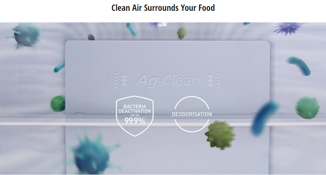 Ag Clean keeps the air in the refrigerator clean with a special filter. It deactivates 99.9%* of bacteria and removes odours to keep your food clean and fresh smelling.