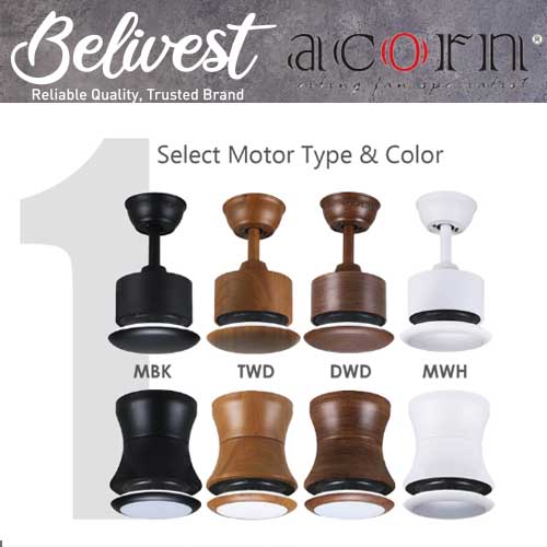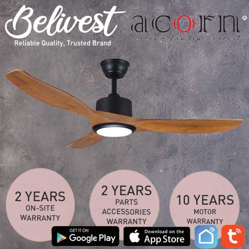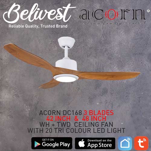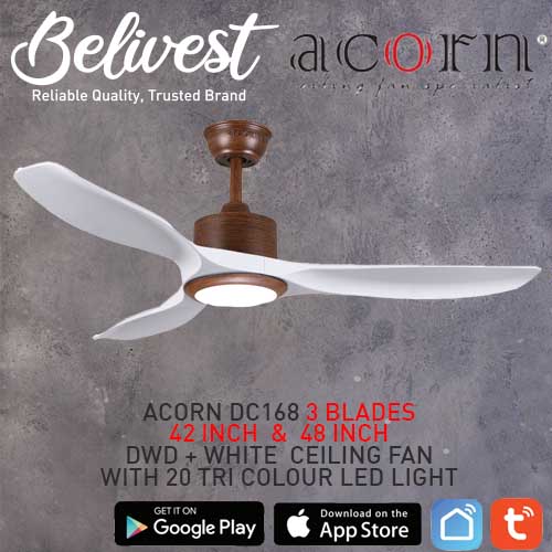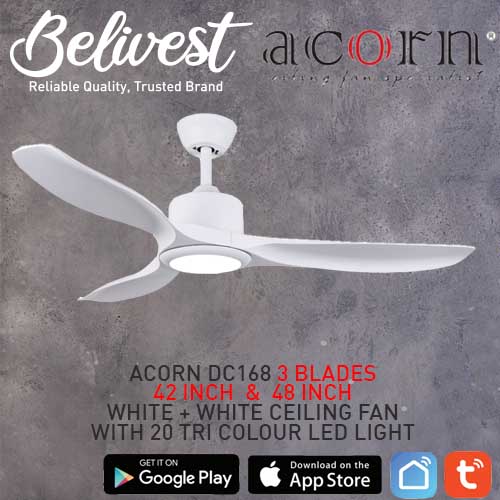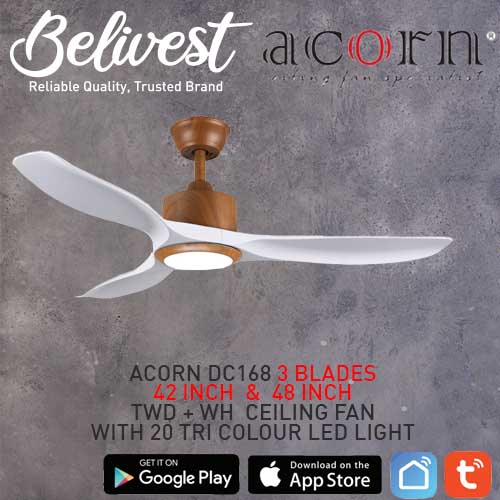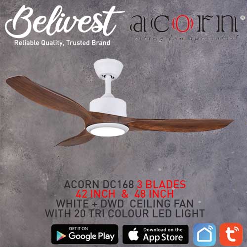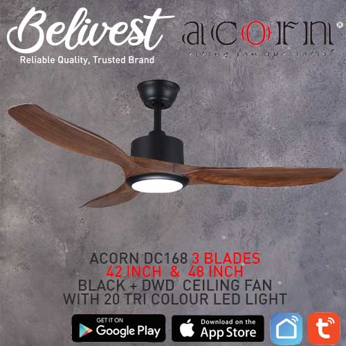 (PRICE GUARANTEED) Acorn DC-168 SMART Ceiling Fan - 3 Blades 42,48 Inch - White/Black/Wood - With/Without 20W LED - google home, amazon alexa, tuya smart life