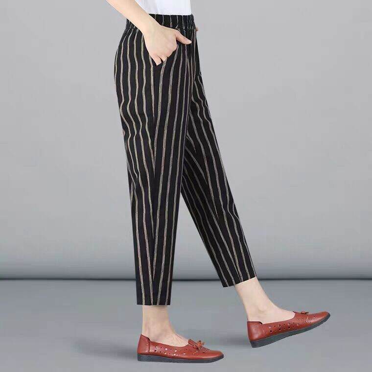 2024ac Summer Pure Cotton Mom Pants Middle-Aged and Elderly Gingham Cropped Pants Middle-Aged Harem Pants Print Casual Pants