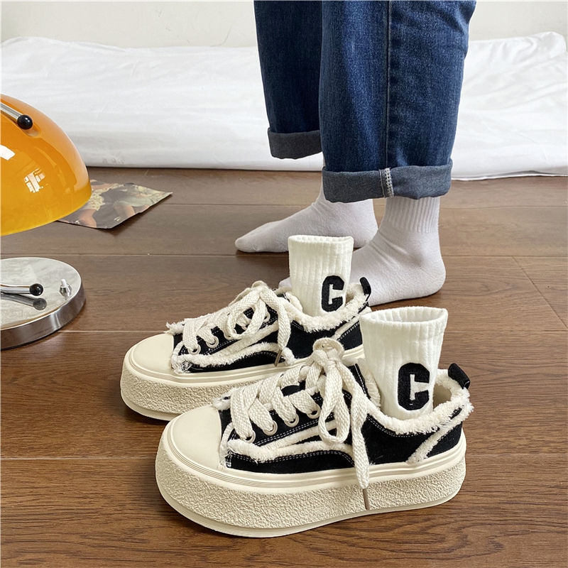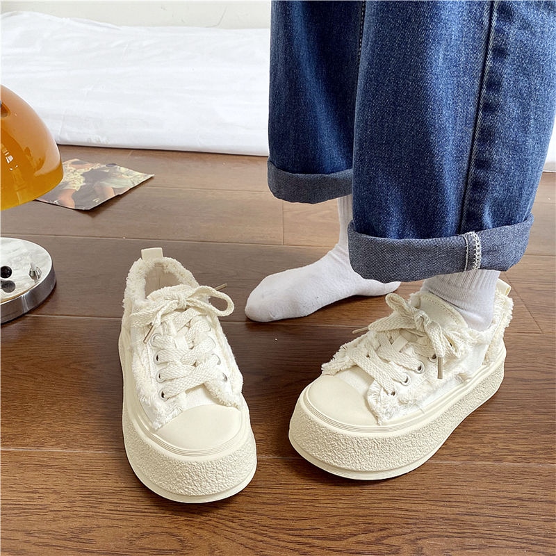 original High-end Uniqlo Yishaonian Japanese style thick-soled white shoes with raw edges for women ins super popular versatile casual sneakers internet celebrity beggar canvas shoes