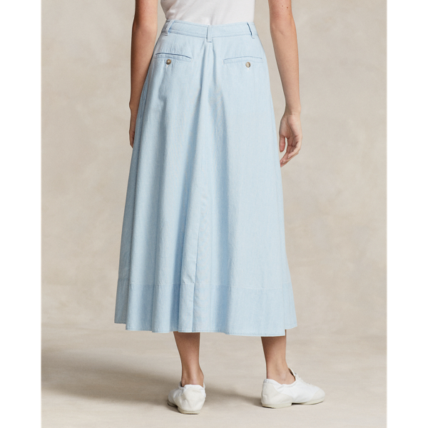 Made with lightweight Japanese chambray, this skirt has a fluid A-line silhouette and a buttoned placket.