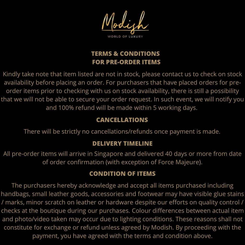 The purchasers hereby acknowledge and accept all items purchased including handbags, small leather goods, accessories and footwear may have visible glue stains / marks, minor scratch on leather or hardware despite our efforts on quality control / checks at the boutique during our purchases. Colour differences between actual item and photo/video taken may occur due to lighting conditions. These reasons shall not constitute for exchange or refund unless agreed by Modish. By proceeding with the payment, you have agreed with the terms and condition above.