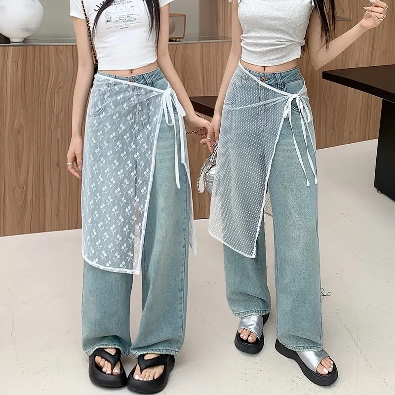 Women INS Blogger Lace Layered Gauze Skirt with Tie Up Spicy Girl Stacked Skirt Y2k Streetwear Apron Wrap Skirt Lace Up Matching Pants