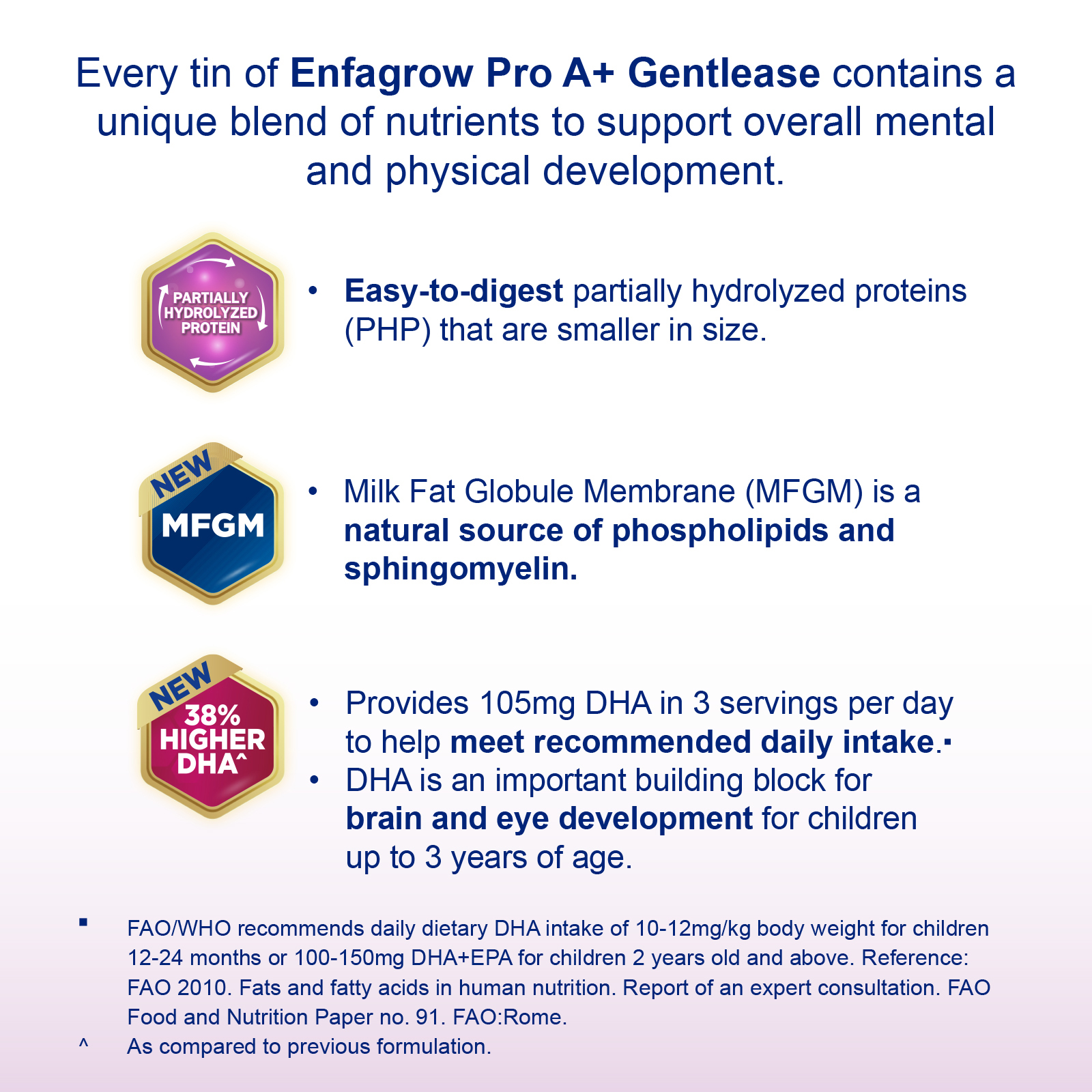 - DHA disclaimer: FAO/WHO recommends daily dietary DHA intake of 10-12mg/kg body weight for children 12-24 months or 100-150mg DHA+EPA for children 2 years old and above. Reference: FAO 2010. Fats and fatty acids in human nutrition. Report of an expert consultation. FAO Food and Nutrition Paper no. 91. FAO:Rome.