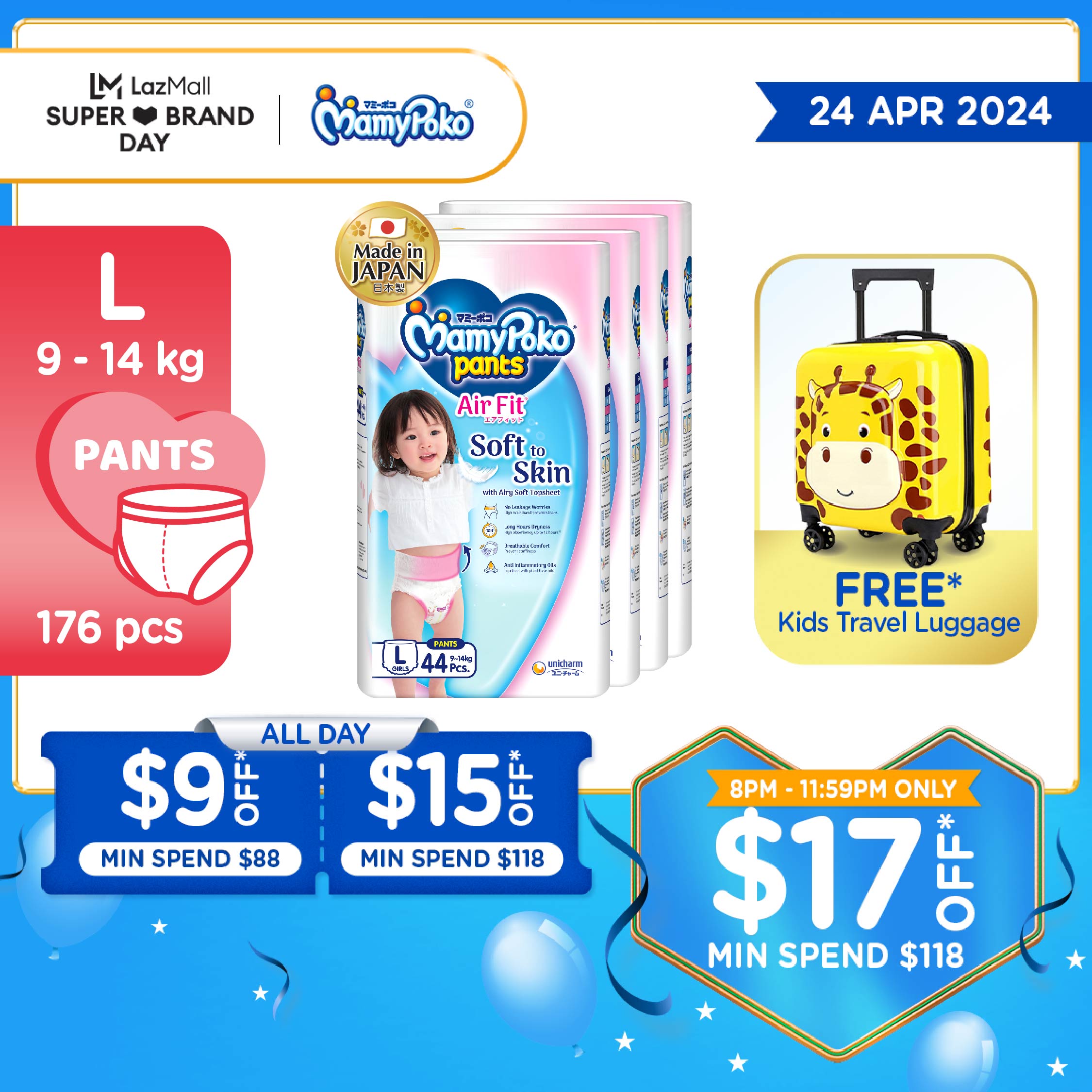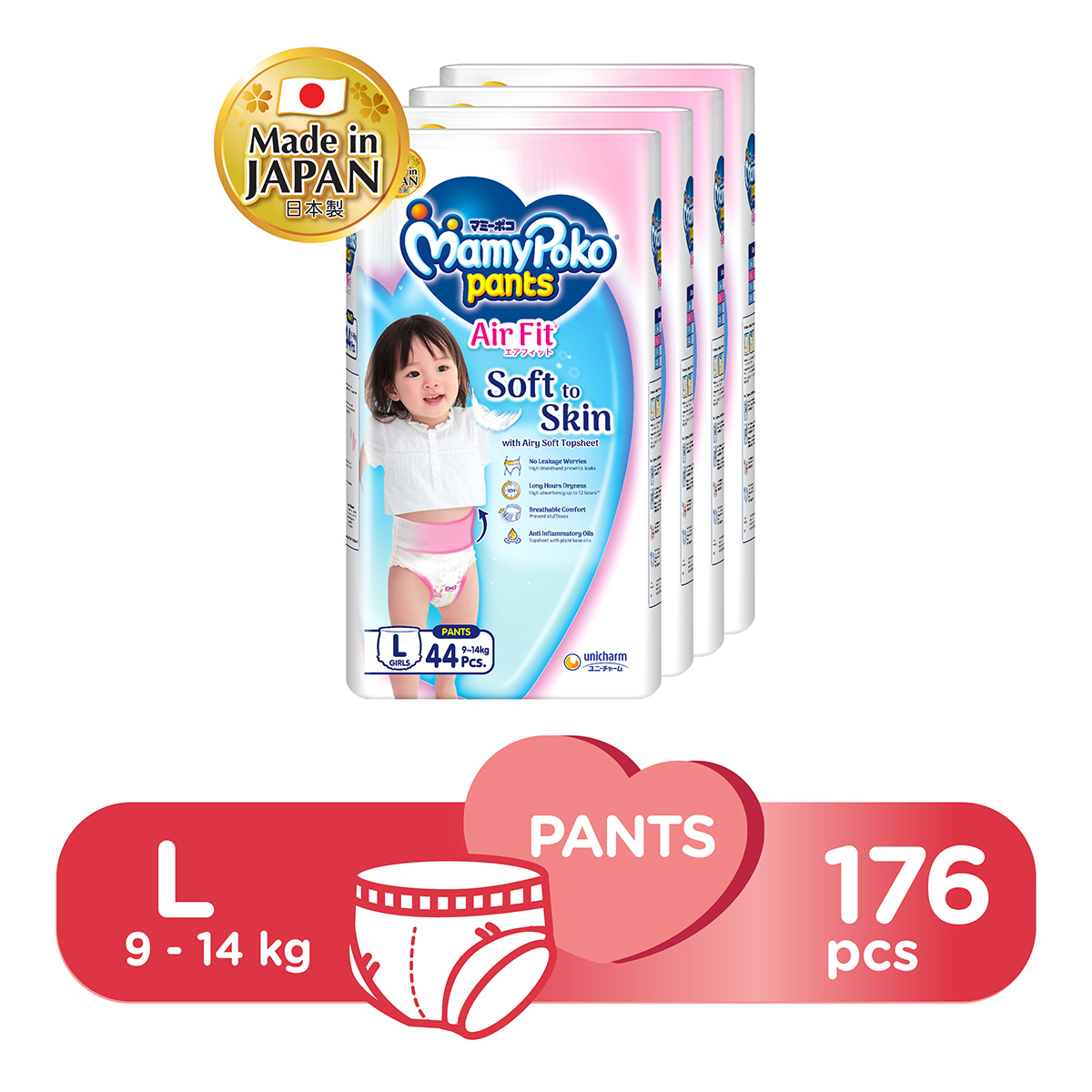 MamyPoko Air Fit Pants Girl Baby Diapers L 44pcs x 4 Packs (9-14kg) [Carton]