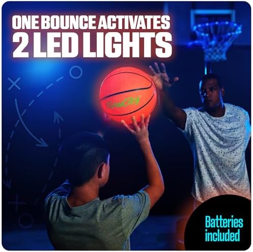 30 HOURS OF GLOW - Perfect for kids, teens and the whole family! This size 7 (29.5") LED basketball features 2 lights that are good for up to 30 hours of nighttime play. IMPACT ACTIVATED - Ready to glow up the night? Our bright red basketball illuminates from the inside with a bounce and automatically shuts off when not in use. THICK SKINNED - Each glowing basketball has a sturdy, water-resistant rubber exterior to help keep the lights safeguarded for indoor and outdoor games. SIMPLE SETUP - This glow up basketball comes with instructions and pre-installed batteries, along with some extras. Simply inflate using a pump to start swishing in the shots. NOTE: Pump not included. FOR ALL AGES - This is a perfect basketball gift for kids of any age. The light up balls make the coolest gifts for teenage boys, making it a blast for everyone.
