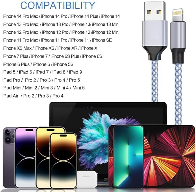 [MFi Certification]Best New Nylon Braided materials and cutting-edge technology ensure a maximum charging speed of up to 2.1A, which is faster than most standard cables. The professional research and development team enables each cable to exceed other people's products in terms of safety during charging. Ultrathin connector heads can be inserted into almost all shell openings. Precise interface design: The nylon braided sheath can protect the cable from knotting and abrasion. Our charger cable has been tested and can be bent 95 degrees and 8000 times. The exquisite metal connector shell head increases the service life and avoids the risk of cracking or other types of fracture. High-quality copper wires can maximize signal quality and increase durability. Sync and charge quickly on the device. Our technical team has conducted thousands of tests to ensure the safety of the durable 8-pin high-speed braided USB sync and charging cable Super compatibility: iPhone 14/13/12/11,14/13/12/11 Pro,14/13/12/11 Pro Max,13/12 Mini, XS MAX, XS, XR, X, 8, 8Plus, 7, 7Plus, 6Plus, 6s Plus, 6s, 6, iPad Air,Air 2, iPad mini,mini 2, mini3, iPad,Airpods,iPod Touch 5th Gen,iPod Nano 7th Gen. Compatible with all operating system devices. High-quality service: All 3 cables have been 100% tested, our team will provide each customer with high-quality service, so that you can buy and use with confidence.