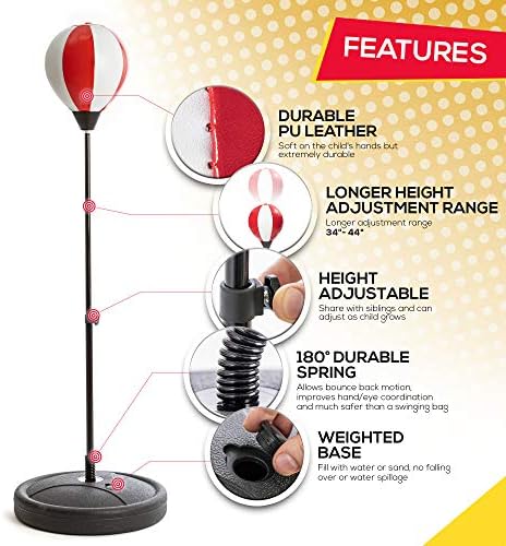 TAKES A SOLID PUNCH: Kids will go crazy over this boxing set! For starters, it’s the ONLY kids punching bag you’ve seen today in fun American boxing colors! It’s a tough freestanding punching bag too! This inflatable bag is made of PU leather and takes everything a kid can dish out! And it keeps bouncing back, ready for more! Also comes with cool kids boxing gloves! HOURS OF HEALTHY FUN: Growing kids are full of energy - and that energy has to go somewhere. This red and white punching bag with stand is modelled on pro boxing equipment, so even if it’s hard for you to get them into sports or outdoor toys, this is different! Wait for it… because they’ll be begging you DAILY to put on their punching mitts and wear themselves out! THE GIFT THAT NEVER WEARS OUT: Birthdays, Christmas – this set covers kids gifts for all ages and occasions! Whether you’re looking for 4 year old boy gifts, girls toys, or toys for 7 year old boys, this SUPER COOL boxing ball set will be the most addictive toy in the house! Look out, even Grandma is likely to try and throw in a few rounds! This kit is designed for kids aged 3 to 10yrs. EASY TO USE: This standing punching bag comes with a FREE pump and 6 ounce boxing gloves for kids. Perfect kids boxing training equipment! The Bullseye Boxing Kit comes with full instructions so it’s easy to set up. It has an adjustable height from 34” to 44” and the round base is solid with a carry handle for transporting around. Made from Non-Toxic, robust PU Leather. OUR PROMISE: We understand a kids boxing gloves and punching bag set is quite a big commitment. Especially for children who may have never had one before! But we’ve got you covered, if you have any issues contact us and we promise to take care of it! So why not try the portable Bulleseye inflatable punching bag set today, risk free.