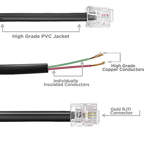 Specifications: BLACK telephone cord , 50 ft Extension cord , 2 Conductor (Pin) cable Perfect For: Phones, modems, answering machines, fax machines, routers, caller ID's, and more Dual Connectors: Two modular plugs at both ends for an easy phone installation Perfect For: Phone cord replacements, modular office and home telephones in need of extension cords for large interior areas to cover Premium Construction: High micron plating ensures an interference free and long term clear connection #100 in