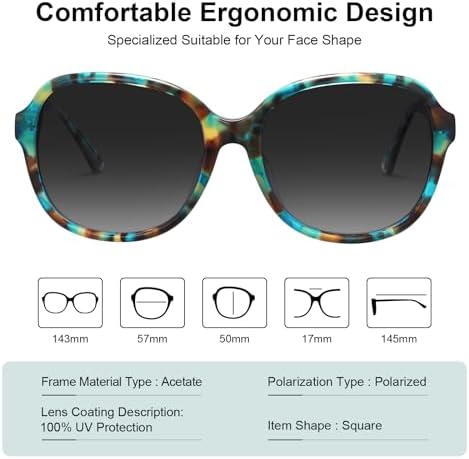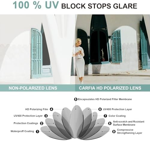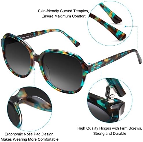 【Ergonomic Construction Sun Glasses for Women】These polarized women's sunglasses with Enhanced lenses coverage (Lens width: 57mm) and specialized lenses curvature for perfect protection against Sidelight. Perfect for golf, driving and anything else the Sun throws at you! 【Polarized UVA, UVB Rays Protection】The lenses are good polarized so eyes are not irritated from the brightness of the sunshine. Instead, it's very soothing and been able to enjoy your daily life without squinting. 【Real Expensive Acetate Eyewear】 Carfia hand-crafted cellulose acetate frame are born with embedded patterns, features rich colours finish, which make them as excellent as the world's most famous brand. Because we think that everybody should get the chance to wear excellent quality Eyeglasses. 【Hardware & Details】 Three-barrel hinge provides durability to the structure of the frame. Exclusive colors that result in the unique pattern of each individual frame. These are aesthetically so nice to keep for fashion or puffy eye coverage on sunny days. 【Package Bonus✚✚✚】 ✔ Womens Sunglasses, ✔ Polarization Testing Card, ✔ Soft Lenses Wipe, ✔ 365 Days Warranty Card, ✔ Nice Leather Eyeglass Case, ✔ Hard Protection Box. 100% risk free to try in case of any situations; just contact the seller without hesitation to solve the problem until your satisfaction. #82,361 in Clothing, Shoes & Jewelry ( ) #815 in