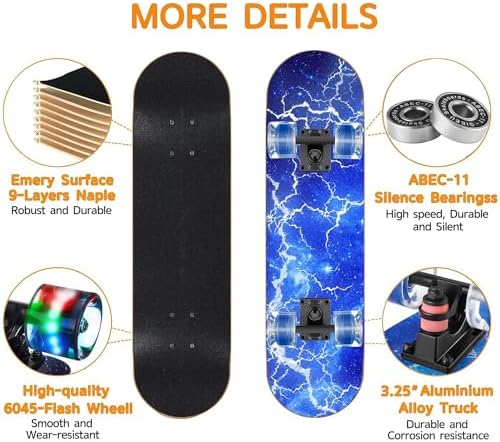 PRESENT✔ Tool T-handle*1 pc , Backup Bearing* 2 pcs STURDY AND SAFE✔ The skateboard is composed of 9-Ply Canadian Maple Wood, strong and durable to withstand riders up to 220lbs. It's equipped with Heavy-Duty Aluminum Alloy Trucks, making them reliable and sturdy, safe for beginners and expert riders. 31" length x 8'' wide, can make enough space for your feet at the top of the deck, you can easily ride, control and carry it around. SMOOTH✔ Anti-shock 6045 blue High Rebound PU wheels with ABEC-11 precision bearings, great fit for all kinds of tricks and cruising in different street surface, skate parks, ramps, pools and no matter the play ground,it works perfectly on all surfaces. PU FLASHING WHEELS✔ The skateboard is with PU flashing wheels (will light up when you use ) make you safe when you ride in dark place and 8”wide non-slip emery deck can not only provide more stability and safety for users but also hold both foot on it, it is safe for all levels of riders. EASY TO STOP✔ When you want stop , just put one of your foot on the ground to stop it. Or you can lean your body to reverse direction to slow down the speed then stop your skateboard.
