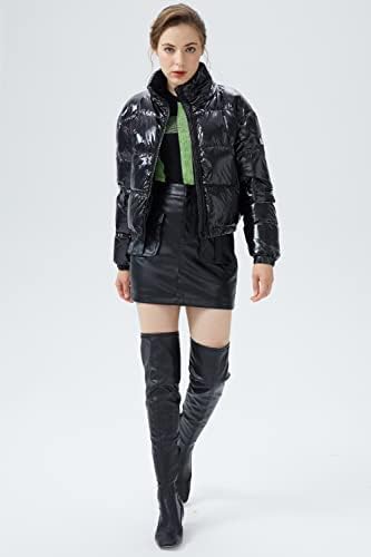 FABRIC: The puffer down coat made by glossy waterproof fabric, shell 100% nylon, lining made by 100% polyester, body/sleeve filler with 90% duck down and 10% feathers,which make this short down coat fashion and warm. FEATURE: The down jacket has ultra-short design, shelling with waterproof bright colors fabric like Red/Purple, which make this coat look more energetic and stylish.In contrast, the black inner lining is soft and skin-friendly. DETAILS: This petite short windproof down coat has plus velvet stand-collar design and branded logo on left sleeve, front with zipper closure, the elastic cuffs and hem make this coat look more puffy, also proviede a better warm effect. STYLE: This shiny short coat is perfect for daily wear, school, vacation, club, dating, party, night out, casual wear and so on. WASH CARE: Hand wash recommended separately with mild detergent and cold water, then drying in the shade, and do not bleach and iron.
