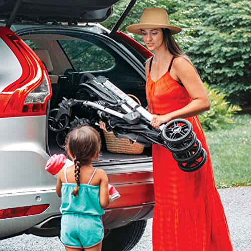 98% Polyester, 2% Plastic [N/A] TRAVEL FRIENDLY – Weighing in at just 17 lbs., this lightweight baby stroller in playful prints with matching aluminum frame is ideal for everyday errands or as a convenient travel stroller. EASY TO USE – A compact fold with automatic storage latch and carry handle make the Liteway a handy and portable baby stroller. DESIGNED FOR COMFORT – The 4-position backrest with easy, one-hand adjustment offers multi-position recline, and the adjustable leg rest provides additional calf support for growing children. Mesh side panels for ventilation ensure a more comfortable ride. SMOOTH STROLLING – Rear-wheel suspension, treaded tires and optional front swivels create a smooth ride, while toe-tap rear brakes keep the stroller in place when parked. ADDED FEATURES – A removable, adjustable canopy with peek-a-boo window offers shade from the sun for baby. The umbrella stroller also boasts padded handles, a storage basket and cup holder for parent comfort and convenience.