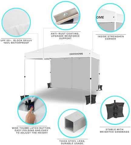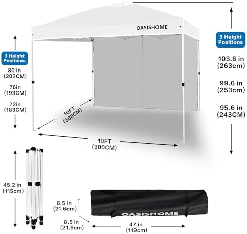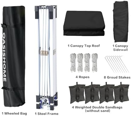 Thicker steel anti-rust coating frame, with legs width 28mm, and cross-bar width 28x12.8mm for the top bracket, sturdy and durable. 150 deniers high-density fabric water-resistant canopy roof, with silver-plated PU lining, can block 99% of harmful rays of sunlight. The sturdy frame is designed to be easily open and easily fold via its super convenient thumb latch button system. Set up is so easy, to finish the entire assembly work only needs two persons and takes a few minutes without tools. Take out the frame and the roof from the wheeled bag and unfold it ajar, unfold the top roof and put it over the frame, then pull 4 legs to each corner end fully, extend the legs, and the sidewall can be installed to block sunlight from one side. Three different sidewall height settings, 72 inches, 76 inches, and 80 inches, more headroom for inside activities. Portability, this tent comes with a bonus roller bag with heavy-duty wheels, made of 600 deniers coated PVC fabric, which is rugged and durable, put into a vehicle effortlessly and take to any place. It also can be a storage bag for the canopy tent without occupying space. What is included, 10x10 Ft pop-up frame; 10x10 Ft top roof; 1 removable high-density fabric sidewall; bonus 1 upgraded durable wheeled roller bag; 4 sandbags; 8 tent stakes; and 4 ropes. Multiple uses, this canopy provides 10'x10' shade coverage, big enough for 6-8 people with a table inside at the same time. It is suitable for patio, backyard, garden, wedding party, beach, outdoor sports, trade show, art event, camping, disaster relief, and more. Reminder, to prolong the service life of the canopy tent, please do not use it in strong wind, heavy rain, snow, storm, and bad weather accordingly.