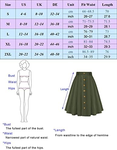 Retro Design: Vintage Skirt Features seven decorated buttons in the front, detachable belt,midi length and pockets, you can put small things like mobile phone, keys into it, high waisted, a-line design, classic solid color Spring & Summer need cute midi skirts! No matter what body type you are, this must-have skirt is a good choice for your summer. This women's skirt flows naturally when you walk and perfectly shows your personality. The A-line silhouette flatters your curves, while the belt comfortably nips you in at the waist Occasion: Simple retro solid-colored design, will never be out of date. The high waisted skirt is suitable for date, work, office, school, travel, party, cocktail, beach, vacations, Halloween, daily casual. Perfect for spring, summer, and autumn, easy to match all kinds of tops Size Guide: Small=US 4-6, Medium=US 8-10, Large=US 12-14, X-Large=US 16-18, XX-Large=US 20-22;Please choose your size according to our size chart image. We accept 30 days of free returns Garment Care: Machine washable, recommended with a laundry bag, do not bleach #22,622 in Clothing, Shoes & Jewelry ( ) #117 in