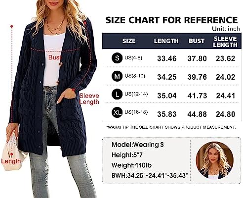 Material:Made of soft and lightweight knit fabric, this long sweaters for women is the perfect addition to your fall and winter wardrobe.Stay cozy and stylish with our womens sweaters cardigan. S=US 4-6, M=US 8-10, L=US 12-14, XL=US 16. Features:Long cardigans for women,chunky cardigans for women,sweater coats for women long,womens cardigan sweaters with pockets,cable knit cardigan women,fall cardigans for women 2023,button down sweater cardigan,open front cardigans,womens winter cardigan,open front outerwear,chunky knitwear Design:With open front design and button-down closure,this long cardigan sweaters for women offers a versatile and effortless look that can be easily dressed up or down for any occasion.It features two side pockets, providing a convenient place to store your essentials. Easy Match:This chunky cardigan is a must-have for fall and winter.Its lightweight yet warm construction makes it perfect for layering and adding a touch of cozy sophistication to any outfit.Dress it up with a pair of jeans or wear it over a dress for a more refined look. Occasions:This casual style long sleeve cardigan allows to create various looks for different occasions. Whether you're attending a casual gathering or a special event, this long sweater cardigan is your go-to outerwear. #54,127 in Clothing, Shoes & Jewelry ( ) #350 in
