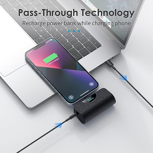【Small and Ultra-Compact】Size of a lipstick,no need a data cable. It’s easy to slip in your pocket or your purse and incredibly portable. Mini portable charger each one size just is 3x1.5x1.02 inch ; Weight around 100g. 【Portable Plug-in Power Bank】No Need Extra Cables for Charging iPhone,the built-in interface allows you to charge your iPhone anytime, anywhere, without having to carry charging cable with you. Stylish and shiny design makes it elegant and unique. 【Dual Input and Smart LCD Display】Dual Input , You can use your iPhone cable or Type-C Cable(Including Package) to charge this small power bank. Smart LCD digital display can easily track the status of your charge.(Notes: The USB-C charging port support for both input and output.) 【5200mAh Emergency Battery Backup】The mini Power Bank Built-in 5200mAh high-quality Li-polymer battery, most iPhone can be fully charged at least once, which is very suitable as a backup power supply for daily use. As an emergency battery pack,it is great combination of the size and capacity. 【Mini Potable Charger Designed for iPhone Series 】Portable iPhone charger is widely compatible with iPhone 14, iPhone 14 Pro, 14 Pro Max,iPhone 13, iPhone 13 Pro, iPhone 13 Pro Max, iPhone 13 Mini, iPhone 12, iPhone 12 Pro, iPhone 12 Pro Max, iPhone 12 Mini, iPhone 11, iPhone 11 Pro, iPhone 11 Pro Max, iPhone XR, iPhone 8, iPhone 8 Plus, iPhone X, iPhone 7, iPhone 7 Plus, iPhone XS Max, iPhone XS, iPhone Se, iPhone 6s, and also other iPhones etc. 【36 Months Support Services 】5200mAh mini power bank x 2 , USB C cable x 2, user manual x 1. AND 36 months warranty policy and 24 hours friendly customer service. easy-to-reach support! Any question, please kindly contact us. 【Important Tips !! 】This small portable charger is compatible with phone case thickness less than 4MM. If your phone case thickness is beyond 4MM, the charging port can not plug into charging slot, you need to remove your phone case.