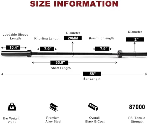 Commercial Quality for Home & Gym: Made of the same material as our Olympic barbells, our heavy duty 4.9 ft training bar will stand the test of time. The high-quality seamless steel was heat-treated to reach the weight capacity of 500LBS. The shaft and sleeves feature a unique black E-coat finish, delivering superb corrosion and oxidation resistance over time and a look that is stylish and aesthetic in your home gym. Outstanding Spin: Extra thick brass bushings and premium bearings in the sleeves makes for buttery smooth rotation. Snap ring retention system secure all the components of the sleeves for a lifetime. No more tightening the hex bolt end sleeves constantly. Medium-Depth Knurling Provides Better Grip Feel: 1.5mm deep diamond knurling with specially trimmed top offers enough gripping power while delivering comfortable grip feel. 28mm diameter shaft is easy to hold and one knurl mark at either side helps to place your hands at correct positions. Specifications: Full length is 58” (4.9ft); Weighs 28LBS; 500 pounds weight capacity; 87,000 PSI tensile strength; 28mm handgrip diameter; No center knurl; No knurl marks. Shaft length is 33.9’’; Loadable sleeves are 10.4” long and 2” in diameter to fit Olympic weight plates. Excellent Performance in All Your Workouts: It is perfect for daily strength training and bodybuilding exercises that can be performed without the need of a power cage - bicep curls, upright rows, bent over rows, deadlifts, presses, hip thrusts, HIIT workouts, etc. Also, with its sleek all-black design, it is a gorgeous equipment for limited space home gym. Buy with Trust in LIONSCOOL: We trust the durability and strength of our barbell so much that we provide a LIFETIME WARRANTY against bending on our barbells, and we always stand by the quality of our products and offer excellent customer service you expect. Just buy with confidence! The bar also comes with a workout poster; spring collars not included. It is definitely the “Bang for Buck” bar for sure.