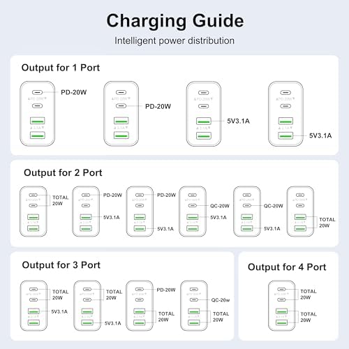 One for All: With totally 40W 4-Port designed (2*USB-C + 2*USB-A), allow users to simultaneously charge four devices. It can really save your time,best replacement for your original charger. High-Speed Charging: With QC+PD 3.0 port, offers fast and efficient charging up to 3X faster than a 5W charger. Charge your iPhone 14 up to 50% capacity in just 30 minutes with the original cable. Cable not included, only 2 Chargers. Universal Compatation: Designed for iPhone 11/12/13/14/15 Pro/12 Pro Max/iPhone 8 and later. The USB charging adapter is compatible for iPhone, iPad, iPod, smartphone, MP3 / MP4 players, play equipment, GPS devices, PC tablet, Google Nexus Tablet, Samsung Galaxy Tab and other digital devices compatible. Compact & Portable: Incredibly compact size for enhanced portability.All this power comes installed in a pocket-friendly compact body, to go wherever the journey takes you. Ideal for home, office and on the go. Safe & Reliable: Equipped with a smart chip, which can adjust the input power of the phone to prevent the phone from overcharging and overheating. What You Get: 2 X 40W 4Ports USB C Charger Block, and friendly customer services.