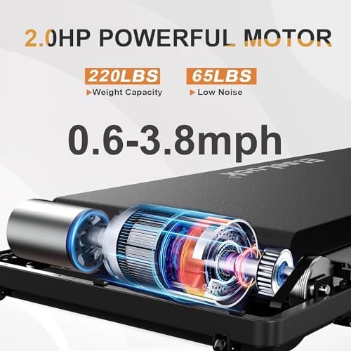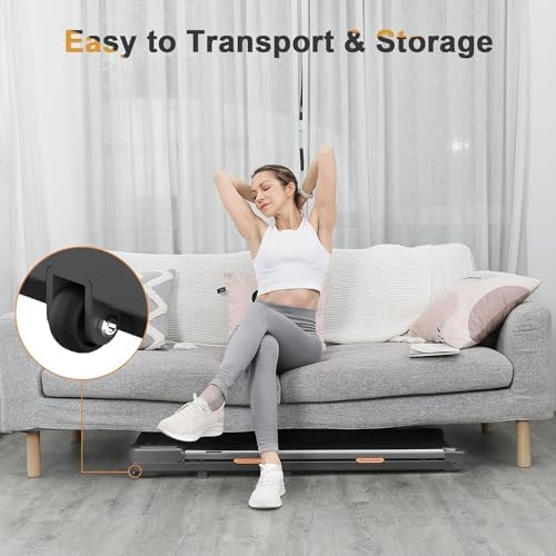 【2 in 1 Walking Pad】 Stay active throughout the day with our 2-in-1 portable treadmill. The speed of walking pad is 0.6MPH-3.8MPH Ideal for working while walking or jogging, this under desk walking pad lets you maintain your fitness routine! 【LED Display&Remote Control】 With LED display screen of Walking Pad, you can keep track of your speed, distance, time, and calories directly. Additionally, the included remote control allows you to adjust speed and start/stop the walking pad without interrupting your exercise. 【Quiet&Anti-slip Design】 Our under desk treadmill features 2.0HP motor which can support weight capacity of 220lbs. The walking belt is composed of 5 non-slip layers and equipped with shock absorption to minimize noise and reduce impact on the knee, muscles, and ankle. It allows you to exercise at home or office without disturbing your surroundings. 【Space Save&Easy to move】 This under desk walking pad treadmill has a compact design. The body size is 48*20.5*4.6 inches and the weight is 54 pounds which can be easily placed under the sofa, bad and desk. With built-in wheel design, it can be easily lift and moved. 【Customer First】 Enjoy peace of mind with our warranty. If you meet any problem while using our products, please contact with us. Our 24-hour customer service team will help you with any issue.