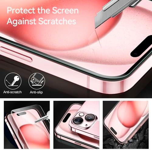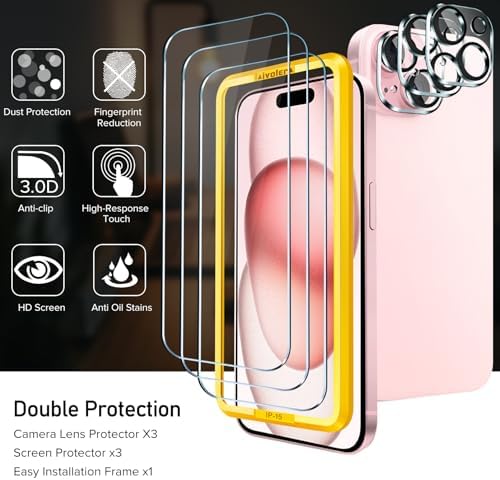 iVoler Screen Protector compatible for iPhone 15 6.1inch 2023, NOT fit for other model. Please check your phone model before purchasing. Before installation, please watch our installation guide and use the Alignment frame to ensure the screen protector installed better, making you have a better using experience. Anti-Fingerprint : The surface of the protective film is treated with Anti-Fingerprint Coating and a plasma oleophobic coating, which is very smooth, effectively prevent fingerprints from sweat and oily smudges, making the screen very easy to clean, helping you get rid of some annoying things in daily use. AR technology & Night shooting function: The glittering rear camera lens protector are featured with augmented reality "seamless" fusion new technology, with enhanced light transmission function, no need to design the flash hole position, even if the flash is turned on at night , it can be 99.99 % Guarantee the original quality of photos and videos. Ultra-Clear & High-Definition :iVoler screen protector is made with high transparent featured which maintaining 99.99% response sensitivity and 99.99% optical-grade light transmittance, effectively blocking and filtering ultraviolet rays, and enhancing the visibility of the screen. Include: 3x Screen protector, 3x Camera Lens Protector,1x Alignment Frame. Edge to edge full screen protector protection, so that the edge of the phone screen is not easily damaged, and provides comprehensive protection for your phone. If you have any questions, you can contact us directly, we will offer you a suitable solution within 1 business day !