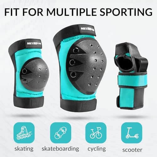 STURDY & PROTACTIVE MATERIAL Made of sturdy, soft EVA padding and tough plastic sheeting, with longer and larger pads and multiple layers of protection to ensure safety during sports and games. EASY TO CARRY The 6-in-1 protective set includes knee pads, elbow pads, and wrist guards. The protective gear set can be carried in a mesh bag when playing sports indoors or outdoors. It can be taken anywhere due to the lightweight and convenience. TWO WAYS TO WEAR Adjustable Velcro and elastic bands provide two ways of wearing. Direct binding for strong people or for summer when wearing short sleeves and shorts.Sleeves + straps. Suitable for thin people or wear long sleeves and pants. FIT FOR MULTIPLE SPORTING The protective gear set can be used with roller skating, skateboarding, cycling, scooter and various action outdoor sports to provide you with protection. To prevent the protective gear from falling off and shifting during exercise, please make sure that each part is worn correctly. COMFORTABLE AND BREATHABLE Double-sided twill elastic is adjustable for secure comfort at the knees, elbows and wrists. And breathable fabric keeps them dry and fresh and reduces sweating during hours of skating.