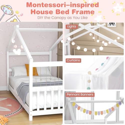KOMFOTT Twin Wood House Bed for Kids, Low Profile Floor Bed Frame with Roof, Headboard & Footboard, Tent Bed for Toddlers, Boys & Girls, Wood Montessori Bed, No Box Spring Needed (White)