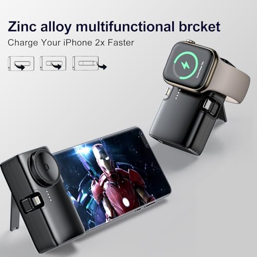✔️Pocket-Sized Power: Equipped with a built-in LT and Type C port connector,compatible with Apple Watch Series making it easy to charge your Apple devices without having to carry an extra cable. ✔️Portable Travel Charger:Compact and lightweight , you can easily put this portable charger in your pocket or hang it on your backpack, which is a great travel companion.Equipped with a holder, it can stabilize your iPhone, providing added convenience for various scenarios. ✔️Compatibility Charge Multiple Devices :This portable battery charger is widely compatible with iPhone 15/14/13/12/Pro Max series, Apple Watch 9/8/7/6/5/4/3/2/1/SE/Ultra, as well as other Type C Android devices or tablets. ✔️PD 20W Fast Charging : The built-in cable supports PD 20W fast charging, providing your iPhone with 60% juice in 30 minutes,Power your device quickly and efficiently. ✔️Superior Safety Features: Portable charger battery pack has built-in over temperature, over current, over voltage and short circuit protection to ensure you use the product safely.
